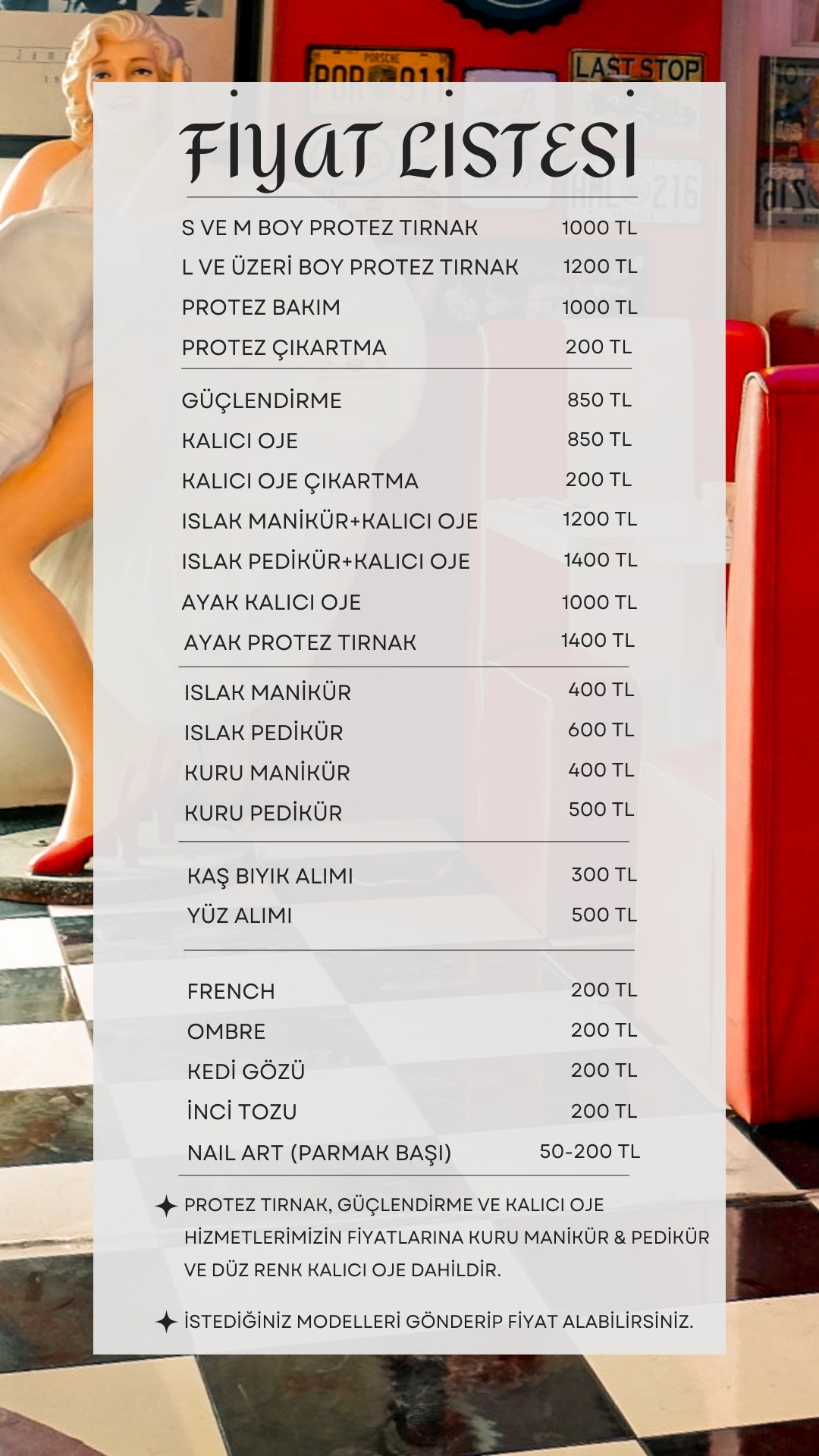 Güzelliğin ve zarafetin sembolü Marilyn Monroe’dan ilham aldık, bakım ve estetiği bir araya getirdik. İzmir Alsancak’ta yer alan Marilyn Nail Center’da, nail art, protez tırnak, kalıcı oje, manikür & pedikür ve ipek kirpik gibi özenli hizmetlerle güzelliğinize ışıltı katıyoruz.